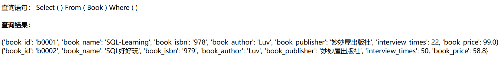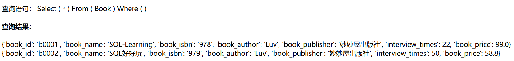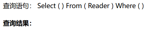 | <p>查询语句: Select ( {{ Select }} ) From ( {{ From }} ) Where ( {{ Where }} ) </p>