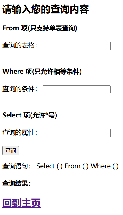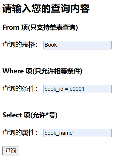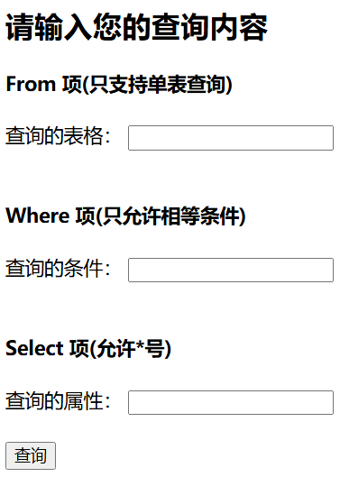 | <!DOCTYPE html> <html lang="en"> <head> <meta charset="UTF-8"> <title>LuvSQL查询</title> </head> <body> <h2>请输入您的查询内容</h2> <form method="post" action="/select_result/"> {% csrf_token %} <h4> From 项(只支持单表查询) </h4> <label for="From">查询的表格:</label> <input type="text" id="From" name="From"><br><br> <h4> Where 项(至多一项) </h4> <label for="Where">查询的条件:</label> <input type="text" id="Where" name="Where"><br><br> <h4> Select 项(允许*号) </h4> <label for="Select">查询的属性:</label> <input type="text" id="Select" name="Select"><br><br> <input type="submit" value="查询"> </form> </body> </html>