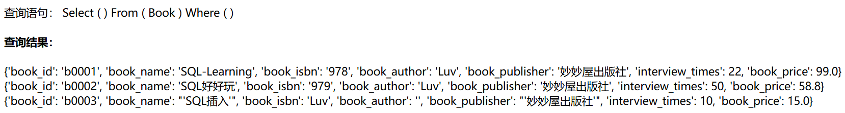 这里使用了print函数,我们先给本地的MySQL的Book表中随便添加一项数据,方便测试。